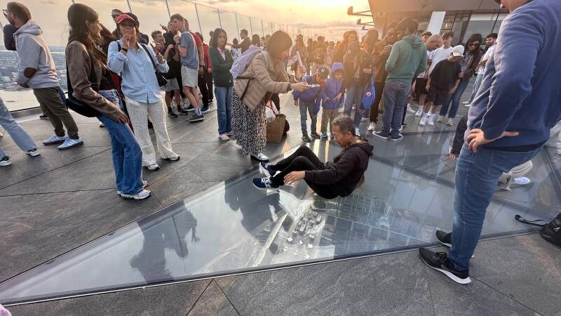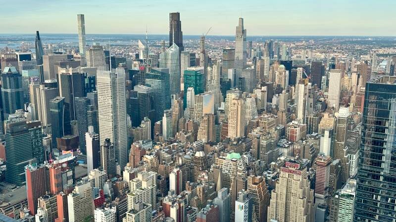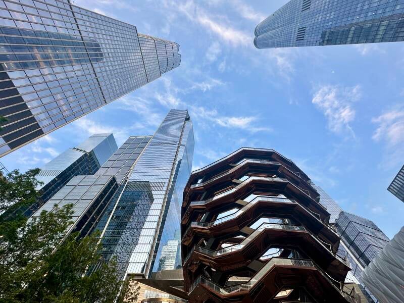 Er staat ons namelijk nog een laatste activiteit te wachten. Met de New York pass heb ik om 18:40 een tijd gereserveerd om op ‘The Edge’ te gaan. Het gebouw is 345 meter hoog. Het aparte aan dit gebouw is, dat het een driehoekig terras heeft dat uitsteekt. Vanaf daar kun je over de hele stad kijken. Ook kun je door de glazen vloer naar beneden kijken. Wanneer we er heen lopen kunnen we het al zien. Het gebouw is tijdens de corona pandemie geopend in Maart 2020. Het is er druk met allerlei mensen, die de mooiste foto willen maken.