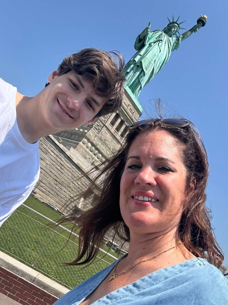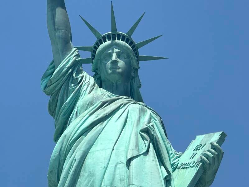 Het is vandaag zonovergoten en het is een graad of 25. Rond 11 uur komen we bij de boot aan die ons naar het standbeeld brengt, die symbool staat voor de vrijheid. Het beeld staat op een klein eilandje, genaamd Liberty Island. Het is druk op de boot, maar Lars vindt een mooi plekje om te gaan zitten. Zelf ben ik er al twee keer eerder geweest. Maar Lars moet het natuurlijk wel even gezien hebben. Het beeld is 46 meter hoog en met de sokkel erbij heeft het een hoogte van 93 meter. Het beeld is een geschenk van Frankrijk. In juni 1885 arriveerde het beeld in de haven van New York. Het duurde 4 maanden om de 350 stukken, waaruit het beeld bestond weer in elkaar te zetten.