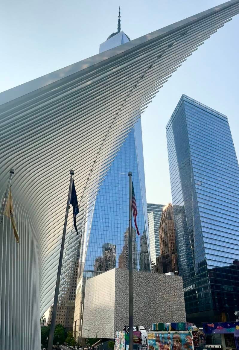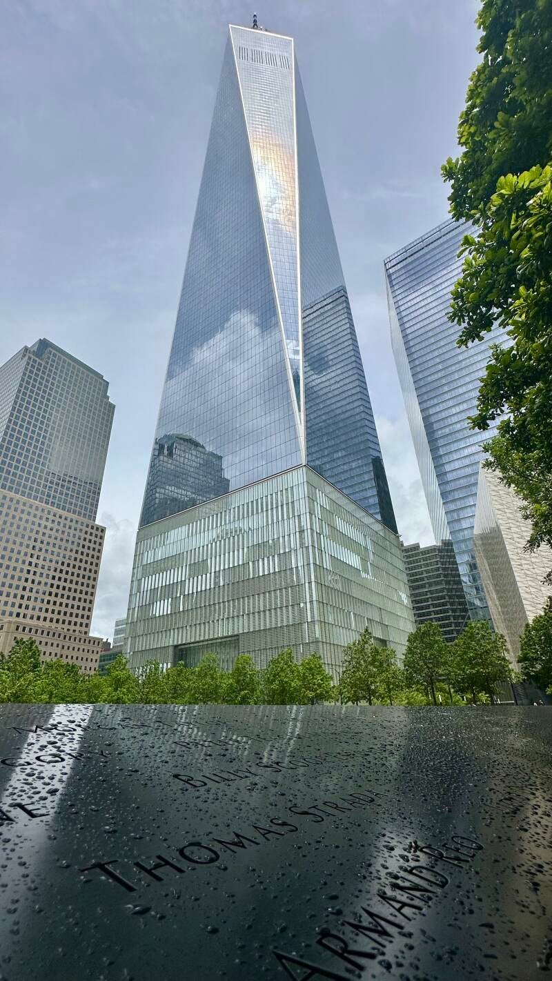 Noortje: Vandaag gaan we niet al te vroeg op pad. Ik haal het ontbijt beneden even op en we kijken nog een tijdje TV in bed. Een van de leukste dingen in America vind ik TV kijken. Vooral de reclames. Overal disclaimers bij. Zo zit ik me te verbazen over pillen die je kunt bestellen die je complete leven positief veranderen. Van een zielige huisvrouw, die de hele dag binnen naar de regen zit te kijken, verandert ze in een vrolijke vrouw die de hele dag visite krijgt en waarbij de zon rijkelijk schijnt. Disclaimer: Je kunt door die pillen wel 231 andere klachten krijgen. Als je al geen angststoornis had, krijg je het wel van die pillen. Bij de nieuws programma’s valt het me steeds weer op dat iedereen is vertegenwoordigd. Man, vrouw, zwart, wit. Ik mis alleen nog een vrouw, die net als ik pluizig haar heeft, omdat de stijltang hier niet in de Amerikaanse stekker past. Genoeg TV gekeken, we gaan op pad. We nemen de metro naar WTC/Cortlandt. In de metro worden we getrakteerd op een mooi optreden van een oude man met een prachtige stem ‘My Girl’ galmt het door de metro. Wanneer we buiten komen, zien we meteen het One World Trade Center. Met een hoogte van 541 meter hoog is het het hoogste gebouw van het Amerikaanse continent. In mei 2013 is de bouw afgerond.