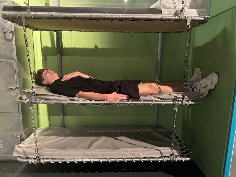 Lars verteld me hoe snel elk vliegtuig kan vliegen en in welke Tom Cruise vloog in de film Top Gun. Het is echt een immens schip. Toen het schip nog actief was, had het een bemanning van 3448 mensen. We laten onze fantasie de vrije loop en spelen, net als de bemanning destijds, een potje dammen. Kleine stapelbedden zijn te zien.