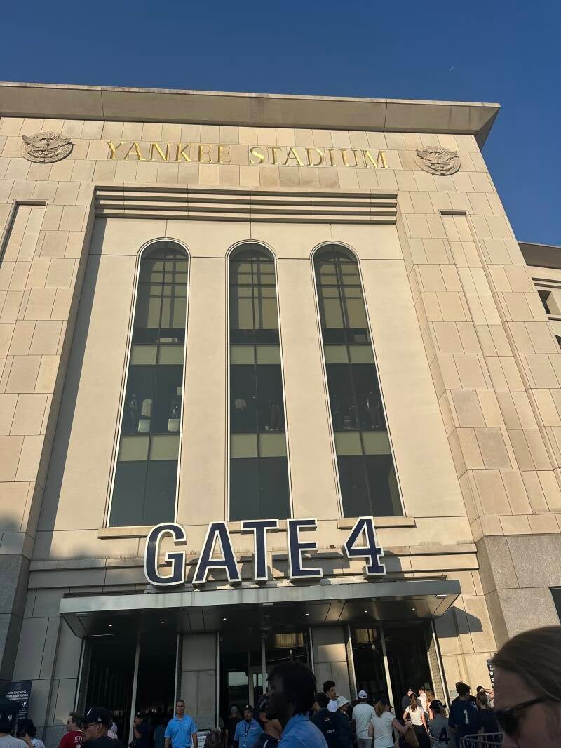 Bij het stadion heerst een gezellige sfeer met barretjes en muziek. Ook is er veel politie. We kopen een Yankee petje en gaan naar binnen.