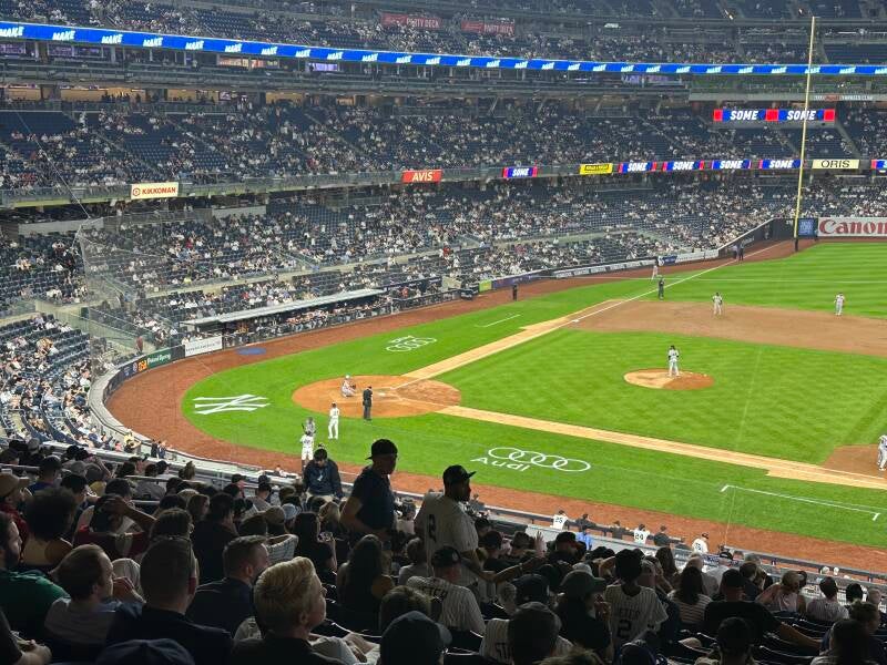 iedereen gaat uit respect staan. Amerikaanser gaat het niet worden. Het spel ligt vaak even stil, aan de klok in het stadion zie je precies wanneer werper de bal weer moet gaan gooien. 'Gooien' klinkt oneerbiedig, want dat is allemaal nog niet zo makkelijk. Deze keer slaat de slagman hem ver het veld in, ze proberen de bal te vangen, maar dat lukt niet, ze rapen hem megasnel van de grond en gooien hem naar het eerste honk. Te laat, of toch niet? Dan komt de VAR erbij, heel het stadion bekijkt de beelden op het grote scherm mee. ' The play is under review' komt er eerst te staan. Dan roept de scheidsrechter dat de slagman optijd op zijn honk was. De menigte juigt. De wedstrijd wordt gespeeld over 3 dagen, dit was dag 2. Uiteindelijk staan de Yankees met 0-4 achter en verlaten we het stadion.