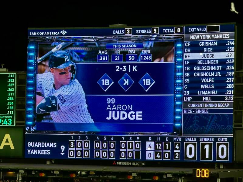 De wedstrijd gaat van start. Cleveland slaat meteen een homerun. Iets wat een uitzondering blijkt te zijn. Tussen de slagen door, is er vrolijke muziek te horen. Het blijkt nog niet zo makkelijk te zijn om het eerste honk te halen. Vlak voor de slagman de bijna 28 meter heeft afgelegd, heeft de veldman de bal meestal al gevangen. De nummer 99, Aaron Judge, blijkt de superheld hier te zijn. Steeds als hij moet slaan, gaat het stadion los. Als het spel even stil ligt, wordt er een persoon in uniform in beeld gebracht 'God bless America' galmt uit de speakers. Het blijkt een oorlogsveteraan te zijn, die geëerd wordt.