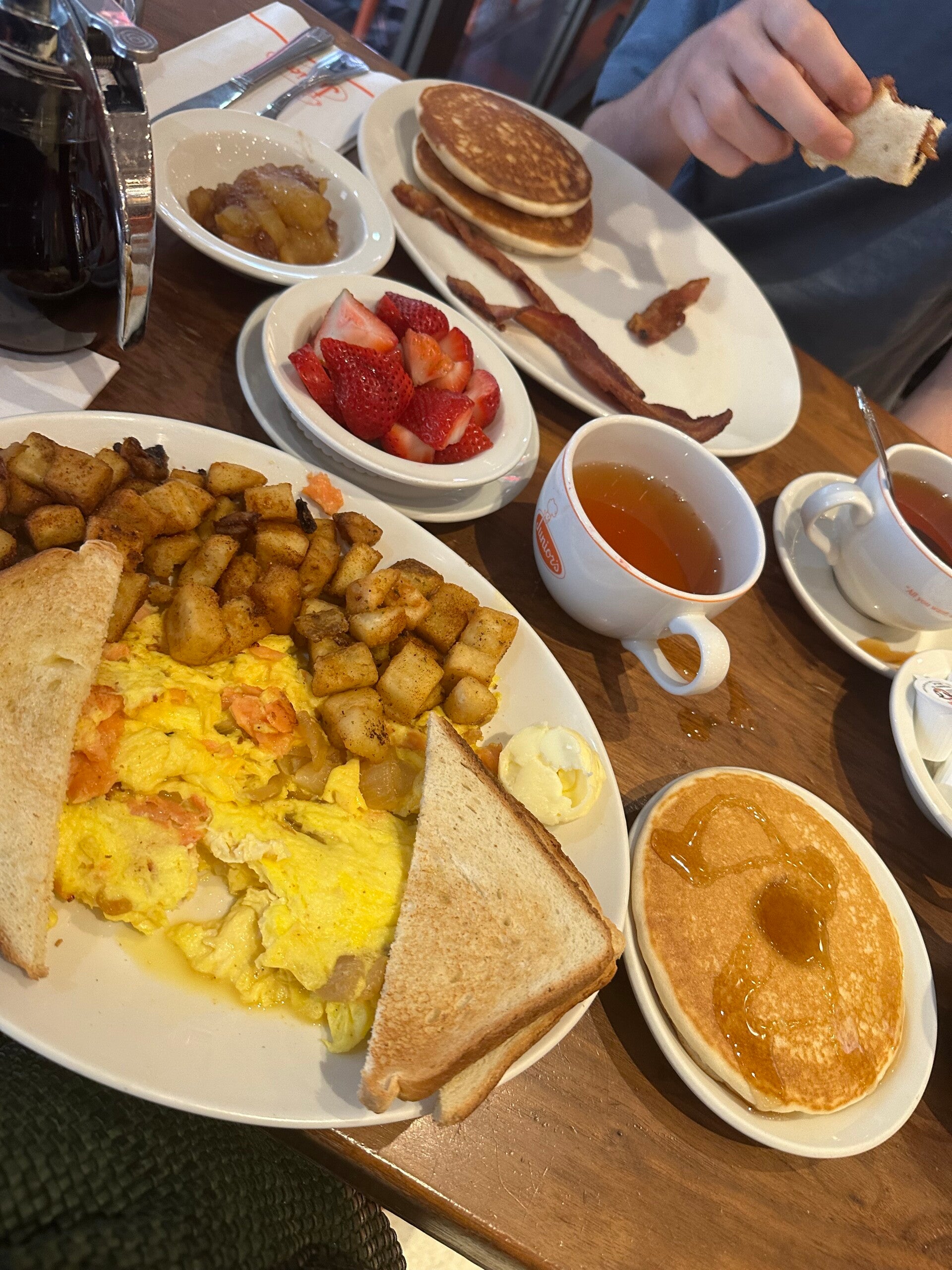 Noortje: Even voordat de wekker afgaat word ik wakker. We gaan ontbijten bij Junior’s. Dankzij Tamara en Saskia weet ik het weer te vinden. Lekkere pannenkoeken en scrambled eggs. Ik heb er zin in. Het is me van de week al vaak opgevallen, het is sinds de covid pandemie ontzettend duur geworden in New York. We bestellen beiden een klein potje thee, die 9 dollar per stuk blijkt te kosten. De pannenkoeken komen. Het is niet wat Lars er van had verwacht, maar eet er met tegenzin toch maar een op. De eieren zijn wel redelijk, de gebakken aardappeltjes hadden van mij niet gehoeven in de ochtend. De aardbeien in het schaaltje zijn hard en niet zoet. 70 dollars lichter en een teleurstelling rijker.