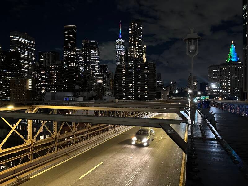 Het uitkijkpunt is zo mooi, als je van de lichtjes van de grote stad houdt. We blijven er een hele tijd staan en lopen dan verder opzoek naar het begin van de Brooklyn Bridge.