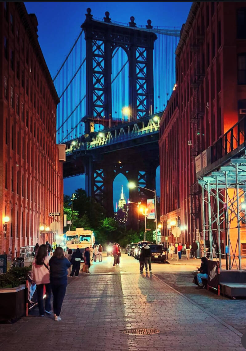 Het is 19:00 uur en we zijn weer lekker uitgerust, we hebben nog wat sport op TV gekeken en we zijn klaar voor een uitstapje naar Brooklyn. We nemen de metro, want naar Brooklyn is het een aardig eindje. Elke keer kijken we onze ogen uit in de metro, naar de diversiteit aan mensen. Er zijn hier weinig saaie burgers te vinden. Aangekomen in downtown Brooklyn gaan we eerst wat eten. Daarna lopen we richting Dumbo, de hippe wijk hier. We passeren eerst nog een grote supermark en zijn benieuwd of hier de prijzen een beetje normaler zijn. Hoe kan de normale New Yorker hier leven als een brood hier 7,99 dolar kost. We staan ons nog een tijdje te verbazen over de prijzen. Dan neem ik Lars mee naar het uitkijkpunt. Onderweg zien we de Manhattan Bridge en door de brug heen zien we het Empire State building. Ik maak er een mooie foto van. Één die meteen als begin foto van deze site mag dienen.