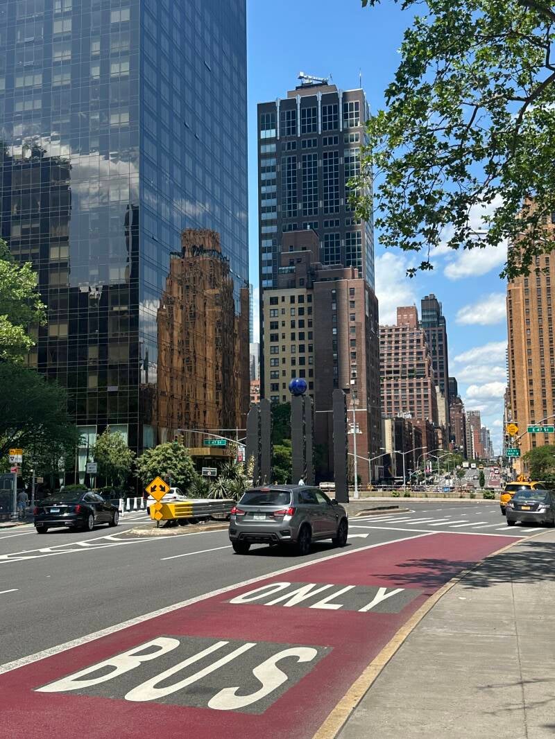 Dan gaan we downtown. Ik wil Lars het gebouw van de Verenigde Naties laten zien. We passeren 2 Trump buildings en komen langs de grote wereld bol. De bol is een eerbetoon aan de Uniphere die zich in Donald Trumps geboortedorp Queens bevindt. Het fietsen gaat hier heel goed. Ondanks dat het een drukke stad is, zoeven we overal zo voorbij. Vooral als we door hebben dat de lange avenues allemaal één richtingsverkeer zijn. Het is dus zaak de juiste avenue op te zoeken.