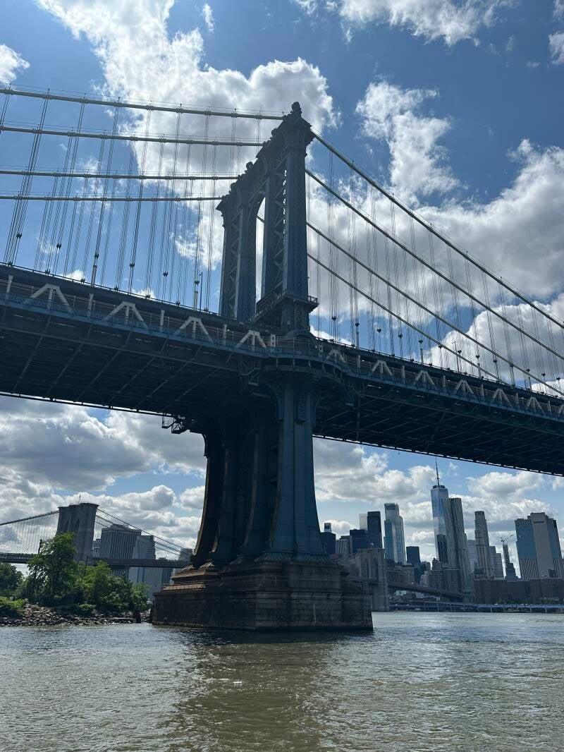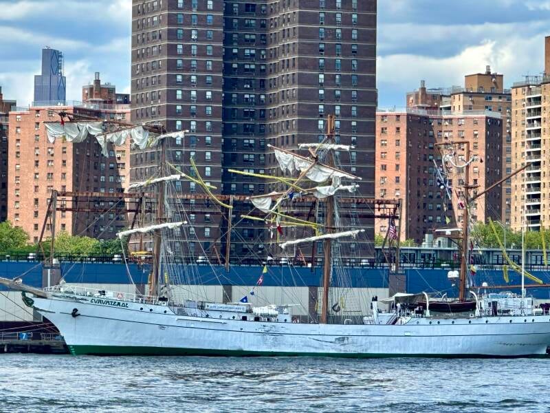 We fietsen verder naar de Manhattan Bridge om zo, net als gisteren, naar Brooklyn te gaan. Daar gaan we langs het water onze lunch opeten. We genieten wederom van het mooie uitzicht. Voor je rust hoef je er niet te komen, want de metro dendert om de paar minuten over de brug. En dat gaat met een hoop kabaal gepaard. Dan zie ik ineens het Mexicaanse zeilschip liggen die op 18 mei tegen de brug vaarden. Met de masten als geknakte houtjes, ligt hij troosteloos in de haven.